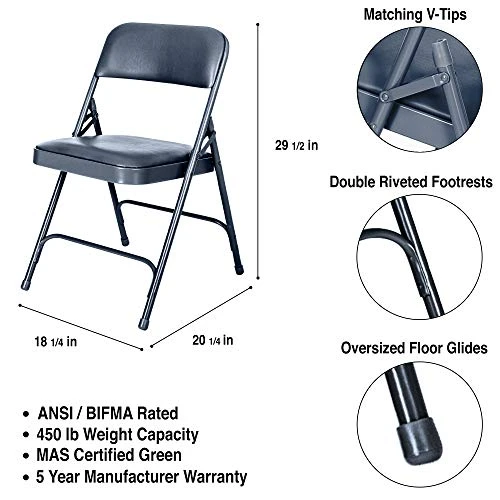 - Versatility: Our vinyl padded steel folding chairs are dependable and sturdy, ideal for use in industrial, educational and home settings.